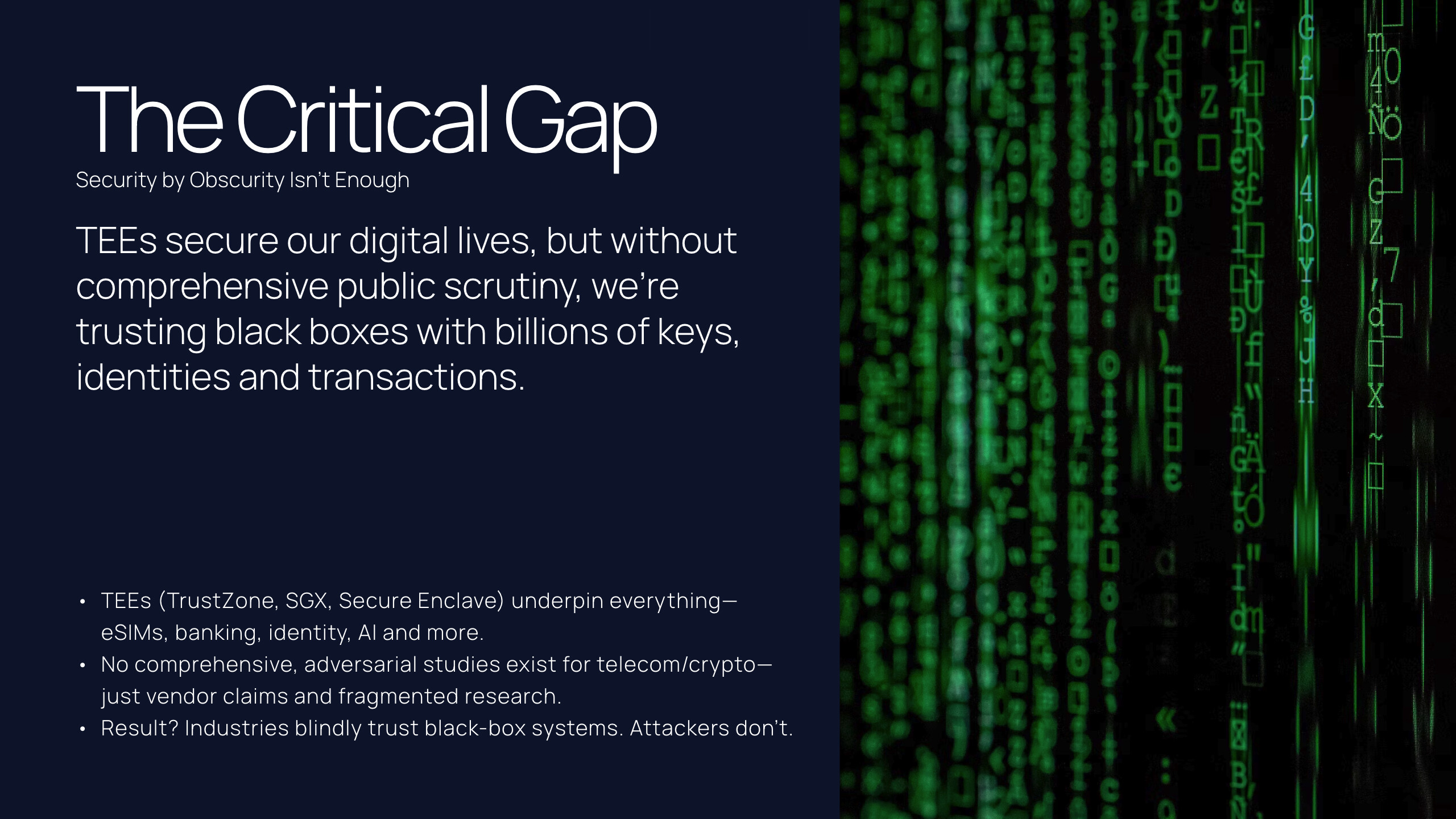 Billions of people rely on their smartphones every day for payments, authentication, and connectivity and yet the hardware foundations that make this trust possible remain largely unexamined. Trusted Execution Environments (TEEs) like ARM TrustZone and Apple’s Secure Enclave are the invisible anchors of digital security for regular consumers, protecting cryptographic keys, network credentials, provisioning and attestation processes. But while vendors assure us these enclaves are secure, there has been little independent, adversarial research to verify those claims—especially on mobile platforms.