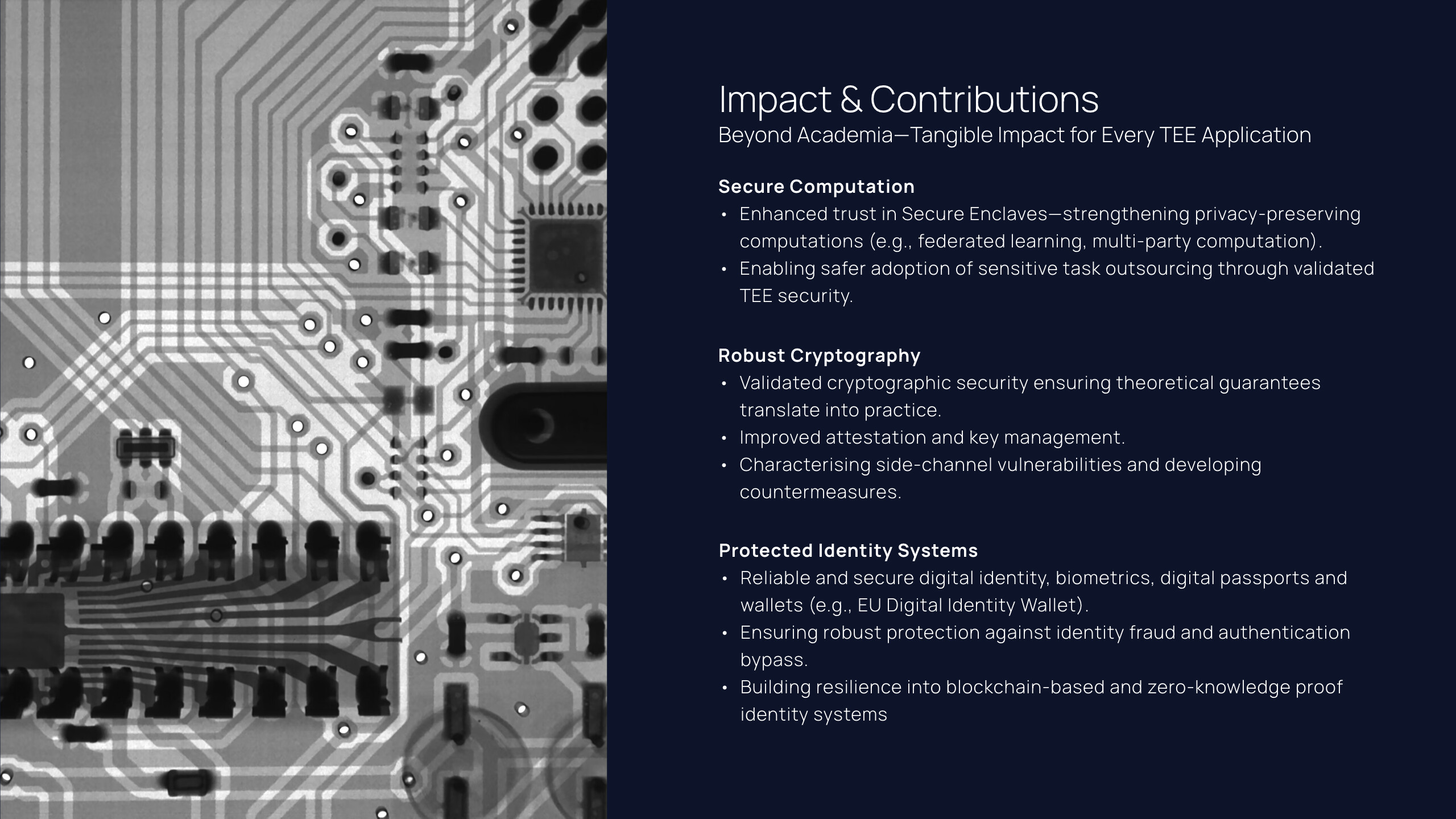 The project is structured with open access in mind. All experiments, codebases, and resulting documentation will be published under free-use open-source licenses. The primary objective is to build shared knowledge and tooling that can be reused across efforts in the broader TEE and privacy-tech ecosystems. We’ve budgeted this as a 9-month focused study with detailed milestones and hardware-in-the-loop evaluations.